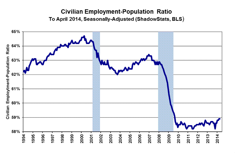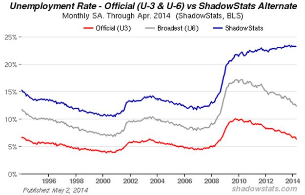 A circumstance where the headline unemployment rate drops from 6.7% in one month, to 6.3% the next, as seen in March and April 2014, usually would be great news, with a large number of unemployed gaining jobs, and with employment rising. Instead, the current circumstance is a horror story, with all of the reduced unemployment and a portion of the previous employment disappearing from the labor force, with the disappearing individuals presumably giving up looking for work.