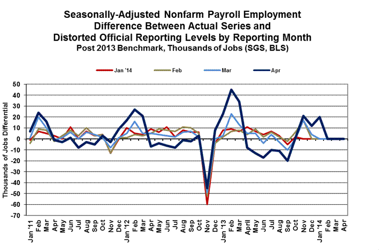 Seasonal Boosts to Payrolls. The BLS uses a concurrent seasonal factor process to seasonally-adjust its payroll-data series. Beyond the instabilities of concurrent seasonal adjustments, though, the BLS simply does not report its historical series on a consistent or comparable basis. Each month, new seasonal factors are calculated in determining the adjusted payrolls, which revise the seasonally-adjusted historical series going back at least five years. The BLS, however, only publishes three months of consistent data, where, for example, the adjusted April 2014 payroll numbers are not comparable with data before February 2014.