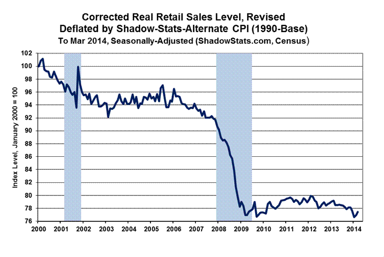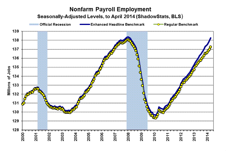 Separately, the following graph of payroll employment levels (prepared initially for the Second Installment of the 2014 Hyperinflation report), plots not only the official current headline payroll levels, but also what ShadowStats estimates the headline levels would be if the benchmark revision of February 7th (see Commentary No. 598) had been handled as a regular benchmark revision, and not as a series redefinition that introduced gimmicked, new upside biases to the headline numbers. The difference is that the headline nonfarm payroll level for April 2014 is about one-million jobs higher than it would have been with the regular reporting and revision procedures. As an aside, the headline series appears to be within one month of recovering its pre-recession high.
