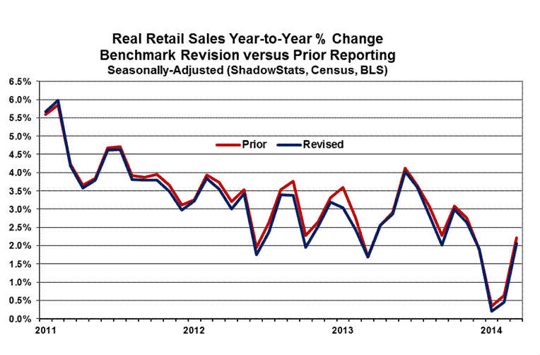 Retail Sales Growth Overstated in Recent Years. The Census Bureau published its annual benchmark revision of retail sales on April 30th, incorporating new seasonal factors, corrected data and the 2012 census of retail sales. The dominant factor in the revisions was the 2012 census, which lowered monthly year-to-year growth rates by an average of 0.1% in 2011, and by 0.2% from January 2012 onward, through March 2014. For the year of 2012, the level of retail sales activity was restated lower by 0.24%. These revisions should reduce prior GDP growth estimates back through 2011, but that effect will not be seen until the annual revisions to the GDP due for July 30th.