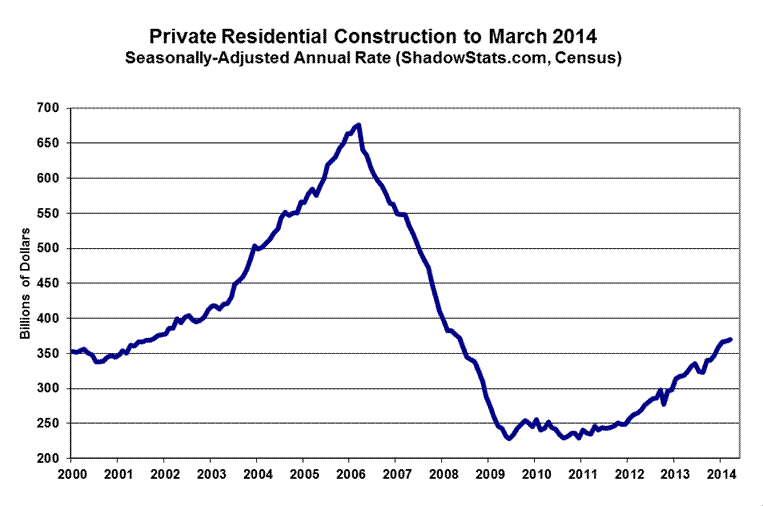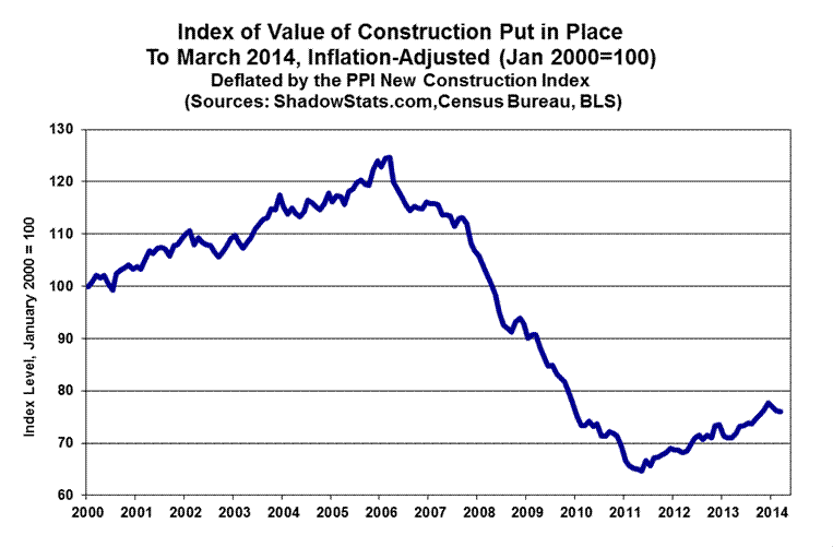 Minimal Growth in Headline Construction Spending Was in the Context of Downside Prior-Period Revisions. The statistically-insignificant 0.2% headline gain in March 2014 construction spending left March activity at a level 0.3% below that initially reported for February. Such is typical of the unstable reporting and volatile revisions in a series where the regular monthly reporting rarely is statistically-significant. As shown in the graphs that follow, the collapse in construction spending since early-2006 into a period of protracted stagnation has not been close to an economic recovery, particularly after adjustment for inflation.