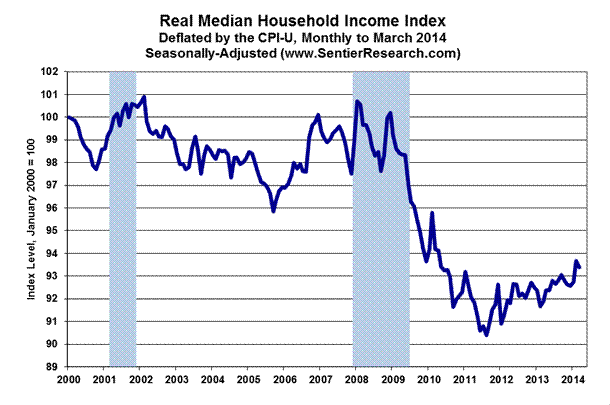 The first graph following of real median household income by month, based on data published by www.SentierResearch.com, showed continued income stagnation in March 2014, with real median household income remaining near the cycle-low for the series.