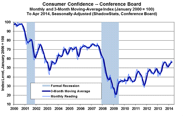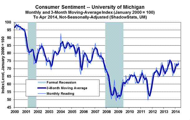 The second and third graphs following reflect the April 2014 reporting of the ever-volatile consumer confidence (Conference Board) and consumer sentiment (University of Michigan) indices. Current levels for both series remain deep in traditional-recession territory. The patterns with these series, as with household income, have been of collapse and stagnation, as opposed to the pattern of economic collapse and recovery indicated by the faulty GDP series.