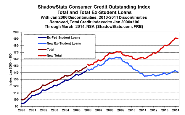 No Relief from the Consumer Liquidity Squeeze. As discussed frequently in these Commentaries, significant, structural liquidity problems continue, and they impair and constrain consumer activity. Except for the plot of consumer credit outstanding, as of March 2014, new details for the accompanying liquidity-related graphs have not been published since they were shown last in Commentary No. 623.