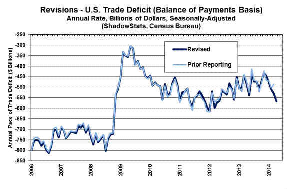 Benchmark Trade Balance Revision Indicated Further Weakness in Both First- and Second-Quarter GDP Reporting. The annual benchmark revision to the monthly U.S. trade balance detail is discussed and graphed in the Opening Comment, with the new inflation-adjusted numbers also discussed in the real trade deficit detail following. Deterioration in the trade deficit—both before and after inflation adjustment—has been worse than previously reported, with negative implications both for further first-quarter 2014 GDP growth revision and for the initial reporting of second-quarter 2014 GDP growth (scheduled for July 30th).