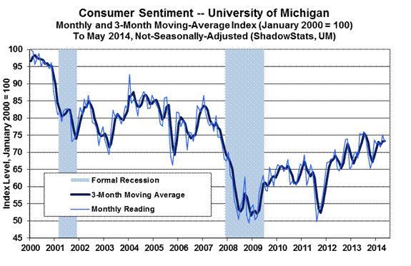 The second and third graphs following reflect the final May 2014 reporting of the ever-volatile consumer confidence (Conference Board) and consumer sentiment (University of Michigan) indices. Current levels for both series remain deep in traditional-recession territory. The patterns with these series, as with household income, have been of collapse and stagnation, as opposed to the pattern of economic collapse and recovery indicated by the faulty GDP series.