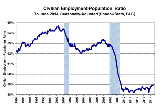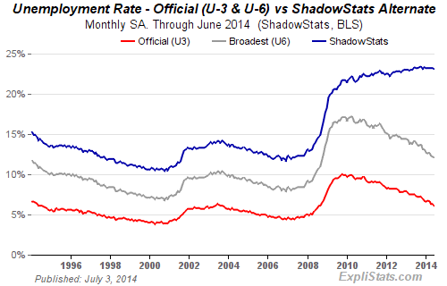 Employment and Unemployment—June 2014—“Good News” That Is No Such Thing. Both June 2014 headline jobs growth of 288,000 and headline unemployment at 6.1% were better than market expectations, but they remained far removed from common experience and underlying reality.