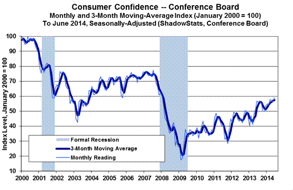 The second and third graphs following reflect the final June 2014 reporting of the ever-volatile consumer confidence (Conference Board) and consumer sentiment (University of Michigan) indices. Current levels for both series remain deep in traditional-recession territory. The patterns with these series, as with household income, have been of collapse and stagnation, as opposed to the pattern of economic collapse and recovery indicated by the faulty GDP series.