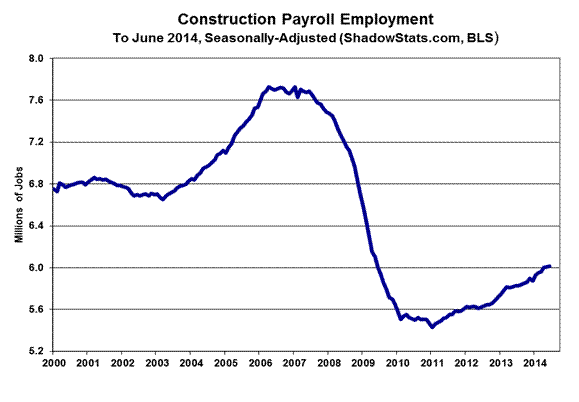Construction Payrolls. The graph of June 2014 construction employment is shown in the Construction Spending section, covering the May construction spending release. In the context of prior-period revisions, headline June 2014 construction employment rose by 6,000 in the month, following a revised 9,000 (previously 6,000) gain in May, and a revised 36,000 (previously 34,000, initially 24,000) gain in April. Total June 2014 construction jobs still were 22.1% shy of the pre-recession peak for the series in April 2006.