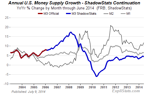 Money Supply M3 Annual Growth Slowed to 4.4% in June 2014, from 4.6% in May. Annual growth in June 2014 M3 is estimated to have been about 4.4%, down from an unrevised 4.6% in May. Monthly year-to-year growth began to slow after hitting a near-term peak of 4.6% in each of the months of January, February and March 2013, the onset of expanded QE3. Growth then hit a near-term trough of 3.2% in January 2014, but that period of slowing growth had reversed fully as of May 2014, with a slight pullback in June. An initial estimate of annual growth in M3, and first readings of annual growth for M2 and M1 in June 2014 have been posted on the Alternate Data tab of www.shadowstats.com.