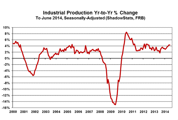 Industrial Production—June 2014— First-Quarter 2014 Production Growth Revised Lower. Headline reporting of a below-consensus 0.2% monthly gain in June industrial production was accompanied by major prior-period revisions. The revised production series now shows a weaker 3.9% annualized growth rate for first-quarter production, down from initial reporting of 4.5%. In turn, what would have been 4.9% growth in second-quarter production was reported at 5.5%.