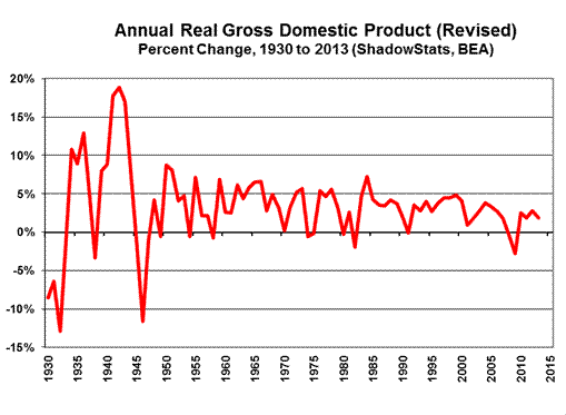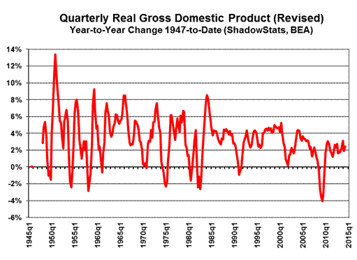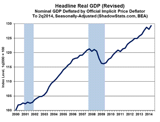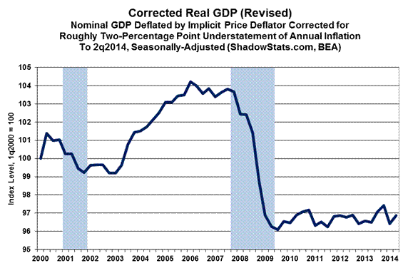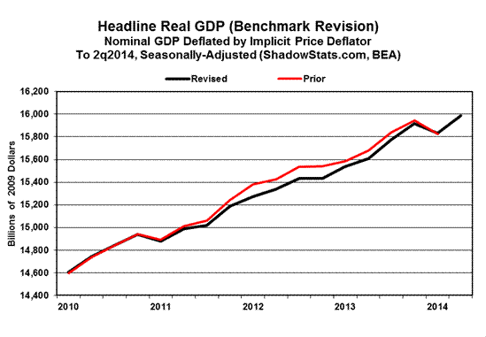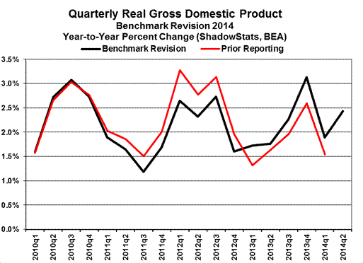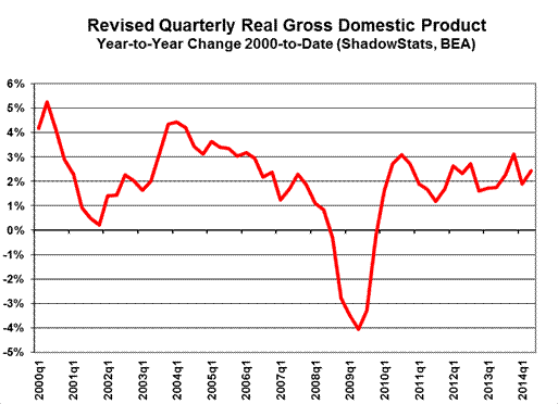 ShadowStats-Alternate GDP. The ShadowStats-Alternate GDP estimate for second-quarter 2014 GDP is a 1.7% year-to-year contraction (-1.7%) versus a headline annual gain of 2.4%, that was against an unrevised ShadowStats 1.9% year-to-year contraction (-1.9%), and a revised headline GDP gain of 1.9% (pre-benchmark 1.5%) in first-quarter 2014 (see the Alternate Data tab).