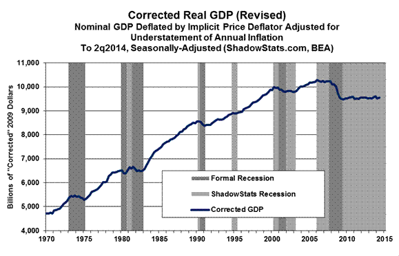 The GDP remains the most-worthless and the most-heavily modeled, massaged and politically-manipulated of government economic series. It does not reflect properly or accurately the changes to the underlying fundamentals that drive the economy. Underlying real-world economic activity suggests that the broad economy began to turn down in 2006 and 2007, plunged into 2009, entered a protracted period of stagnation thereafter—never recovering—and then began to turn down anew in second- and third-quarter 2012 (see 2014 Hyperinflation Report—The End Game Begins – First Installment Revised, and 2014 Hyperinflation Report—Great Economic Tumble – Second Installment ). Irrespective of the reporting gimmicks introduced in the July 2013 GDP (prior) benchmark revision, a consistent, fundamental pattern of historical activity is shown in the accompanying sets of “corrected” GDP graphs.