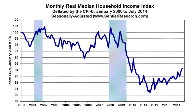 Structural Income Problems Continue—No Fundamental Economic or Financial-System Relief in Sight. Today’s (September 16th) release of the 2013 Income and Poverty report had no surprises. Annual real (inflation-adjusted) median household income for 2013 was consistent with the monthly numbers published regularly by www.SentierResearch.com. The headline annual number showed a small but statistically-insignificant 0.3% real increase in 2013 median annual household income, versus 2012, which showed an unrevised, statistically-insignificant 0.1% (-0.1%) decline versus 2011.