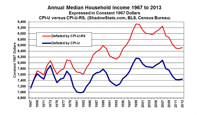 Census Bureau Plays Games with the Official CPI-U Inflation. The next graph shows median household income deflated using two Bureau of Labor Statistics (BLS) inflation measures, the CPI-U (official) and the CPI-U-RS (experimental). With the CPI-U-RS, 2013 median household income held at its lowest levels since 1995 (not 1994) and was below earlier annual reporting only since the late-1980s. An emphasis is made here that these graphs are using alternate government inflation numbers, not any alternate ShadowStats inflation measure, which would show more-severe inflation damage to income.