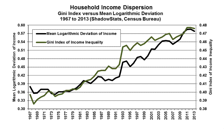 Shown in the following graph are the Gini Index of Income Inequality and the Mean Logarithmic Deviation of Income (MLD), two of the more popular income dispersion series. Some of the finer points and mathematics behind several of the income variance measures are covered in the Census Bureau’s article: The Changing Shape of the Nation’s Income Distribution.