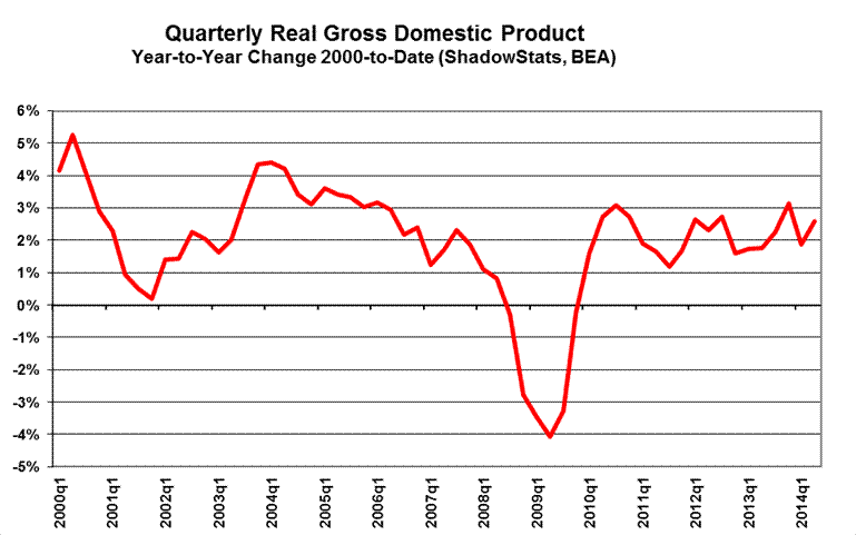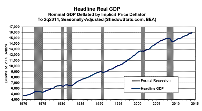 ShadowStats-Alternate GDP. The ShadowStats-Alternate GDP estimate for second-quarter 2014 GDP remains a 1.7% year-to-year contraction (-1.7%) versus the headline revised annual gain of 2.6% (previously 2.5%, initially 2.4%). Those second-quarter estimates were against a ShadowStats 1.9% year-to-year contraction (-1.9%)—unaltered by the July 2014 benchmarking games—and the benchmarked headline GDP gain of 1.9% (pre-benchmark 1.5%) in first-quarter 2014 (see the Alternate Data tab).