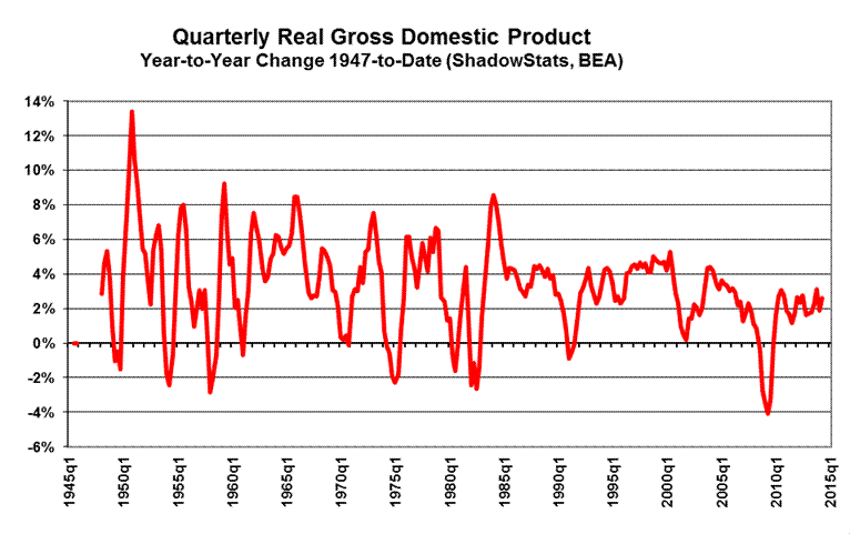 Economic Reality. Even with the third estimate of second-quarter 2014 GDP headline growth of 4.59%, following a contraction of 2.11% (-2.11%) in first-quarter 2014, the general outlook as to economic reality has not been altered. The broad economy still is turning down anew, and a wide variety of monthly economic detail should confirm that in reporting of the next month or two. Accordingly, the gist of much of the following text is along the lines of other recent GDP commentaries, but the details and numbers have been updated for today’s third reporting of aggregate second-quarter 2014 economic activity.