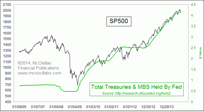Fed’s Activity Has Propped Stocks; Fed Likely Will Move Again to Systemic Liquefaction. Many thanks to Tom McClellan, publisher of the McClellan Oscillator at www.mcoscillator.com, who kindly gave us permission to use the following graph. The plot shows the S&P 500 versus the total Treasuries and Mortgage Back Securities (MBS) held on the Fed’s balance sheet. While the graph largely speaks for itself, Tom’s thoughts—when he published an earlier version of the graph in June—are found at this link: McClellan Financial Publications. Although growth in the Fed’s assets has slowed with the "tapering" in QE3, those assets still held at an all-time high of $4.19 trillion on October 1st, for the third week, as announced by the Fed last night (October 2nd), one week subsequent to the last green point on the chart.