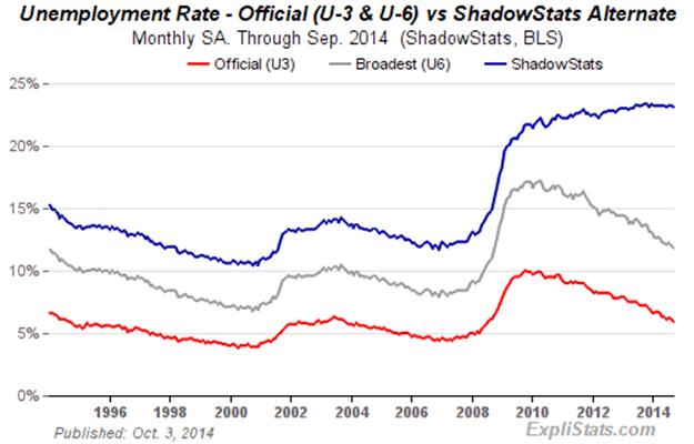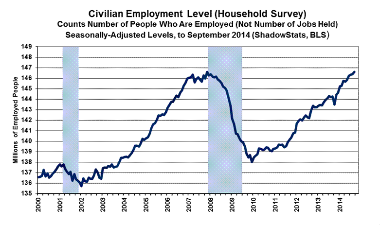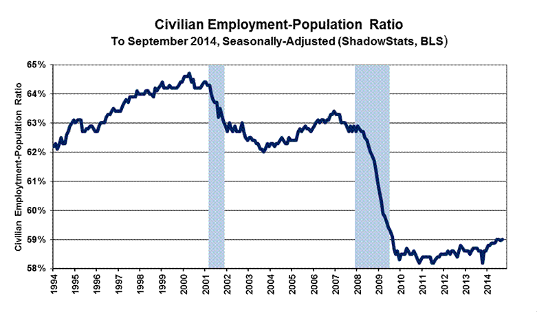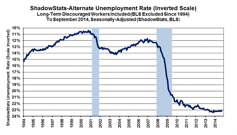 Seriously-Flawed Headline Reporting of Jobs Growth and Unemployment Intensifies. Both the September 2014 headline jobs growth of 248,000 and headline unemployment rate at 5.9% remained far removed from common experience and underlying reality. As discussed frequently in these Commentaries, common experience generally would suggest flat headline monthly payroll employment, plus or minus in September; with an unemployment rate, encompassing all short- and long-term discouraged workers, running above 23%.