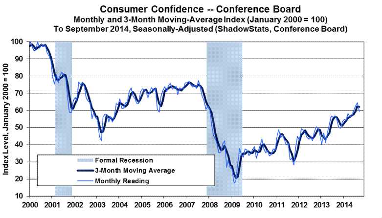 The following two graphs show the latest, month-end September 2014 readings for the Conference Board’s Consumer Confidence Index and the University of Michigan’s Consumer Sentiment Index. Although confidence fell and sentiment rose in September, both series remained deep in historical-recession territory. There has been no economic recovery here, as shown by plunge in activity into 2009 and then a purported recovery, to-date, in headline GDP activity. Instead, as indicated in these and other consumer-related measures, economic reality remains an economic plunge into 2009, followed by a period of prolonged, low-level stagnation, with activity now turning down anew.