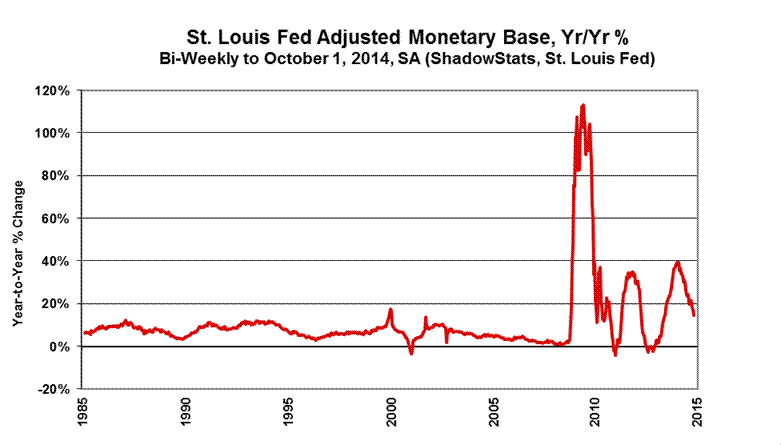 Monetary Base Just off Record High. Reflected in the following graphs, again, in the context of what has been ongoing “tapering” in debt purchases, the monetary base (St. Louis Fed measure) hit an all-time high in the two weeks ended September 17, 2014, at $4.150 trillion, but then backed off sharply in the two-week period ended October 1, 2014 to $4.036 trillion. Such period-to-period volatility in recent months has not been unusual. Year-to-year growth, with current changes compared to even faster growth the year before, was at 17.0% in the September 17th period, with annual growth at 14.4% in the October 1st period.