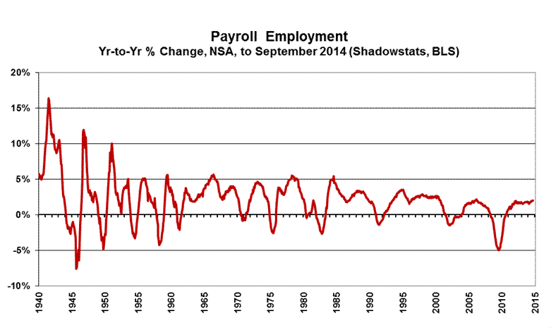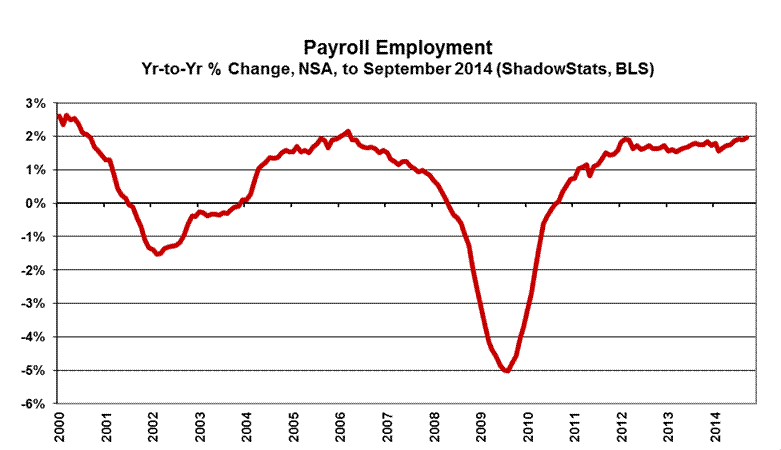 For September 2014, year-to-year or annual nonfarm payroll growth was 1.96%, which was a new post-recession high, versus revised annual growth of 1.89% (previously 1.84%) in August, and revised 1.93% (previously and initially 1.92%) annual growth in July 2014. Had the 2013 benchmark revision been standard, not a gimmicked redefinition, year-to-year jobs growth as of September 2014 would have been about 1.5%, consistent with near-term peak annual growth of about 1.9% in February 2012.