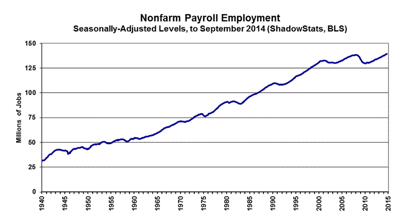 [The remaining text in this Household Survey section is unchanged from the Commentary covering the September 2014 labor data.] As seen in the usual graph of the various unemployment measures (in the Opening Comments), there continues to be a noticeable divergence in the ShadowStats series versus U.6, and the ShadowStats series and U.6 versus U.3. The reason for this is that U.6, again, only includes discouraged workers who have been discouraged for less than a year. As the discouraged-worker status ages, those that go beyond one year fall off the government counting, even as new workers enter “discouraged” status. A similar pattern of U.3 unemployed becoming “discouraged” and moving into the U.6 category also accounts for the early divergence between the U.6 and U.3 categories.