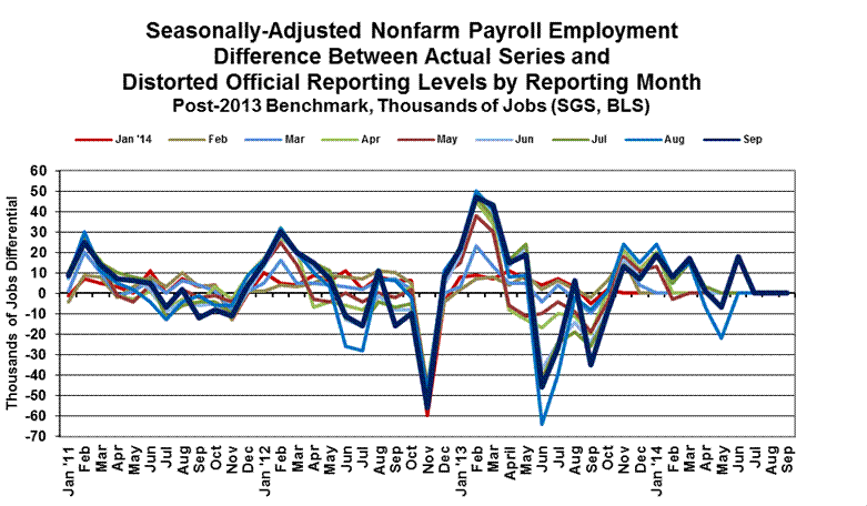 Separately, as can be seen in the wild month-to-month revisions of the seasonally-adjusted data in the graph found in the Concurrent Seasonal Factor Distortions section, significant changes were made to historical September seasonal adjustments, indicating unusual distortions in the headline September 2014 that cannot be tracked, shy of a private recalculation of the series, as done by ShadowStats. The detail required for such calculations is available from the BLS, but only for the payroll reporting. The monthly unemployment-related detail from the troubled household survey simply is not comparable month-to-month, and there are no options for private recalculation on a consistent basis.