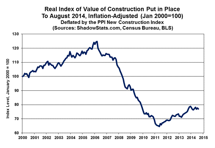 Construction and Related Graphs. The first two graphs following reflect total construction spending through August 2014, both in the headline nominal dollar terms, and in real terms, after inflation adjustment. The inflation-adjusted graph is on an index basis, with January 2000 = 100.0. Adjusted for the PPI’s NCI measure, real construction spending showed the economy slowing in 2006, plunging into 2011, then turning minimally higher in an environment of low-level stagnation and now showing some pullback in the most recent reporting.