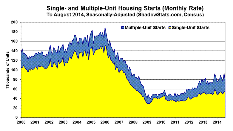 The next two graphs following cover private residential construction along with housing starts (single- and multiple-unit starts) for August (see Commentary No. 660). Keep in mind that the construction spending series is in nominal (not-adjusted-for-inflation) dollars, while housing starts reflect unit volume, which should tend to be more parallel to the real (inflation-adjusted) series. Where the private residential construction spending had been in recent upturn through most of 2013, that now has turned lower, trending to the downside in 2014, even before adjustment for inflation.