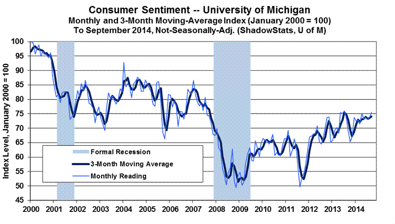 The first two graphs following show the month-end September 2014 readings for the Conference Board’s Consumer Confidence Index and the University of Michigan’s Consumer Sentiment Index. Although confidence fell and sentiment rose in September, both series remained deep in historical-recession territory.
