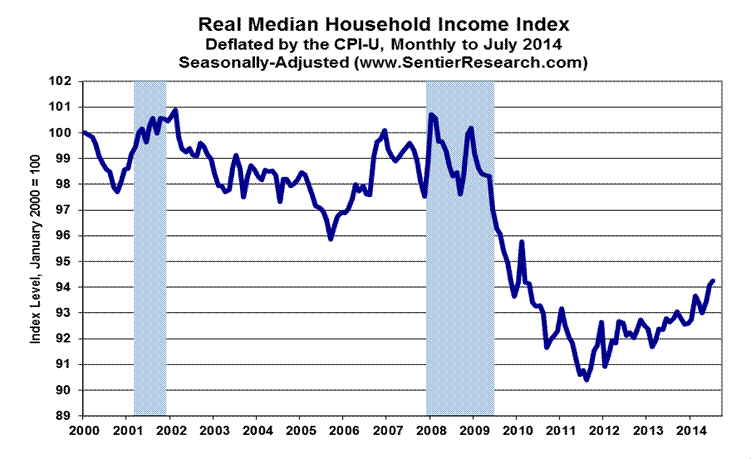 Real median household income has shown continued income stagnation through July 2014. As the GDP purportedly started its solid economic recovery in mid-2009, household income plunged to new lows. Deflated by headline CPI-U, the same series, published by the Census Bureau on an annual basis (Commentary No. 658), showed further that 2013 annual real median household income held at a low level of activity, at levels that also had been seen in the late-1960s and early-1970s.