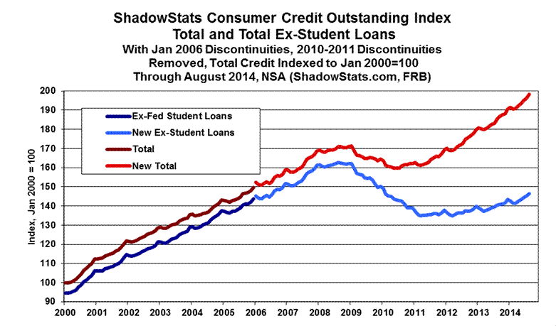 The next two graphs show monthly real median household income through July 2014, as reported by www.SentierResearch.com, and the August 2014 detail for the Federal Reserve’s series on consumer credit outstanding.