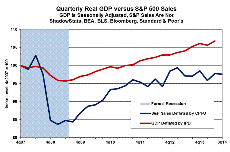 New reporting of relatively hard annual numbers from 2013 showed ongoing economic contraction, with no trend towards sustainable economic growth (see Commentary No. 656). Also, as discussed in today’s Opening Comments section and Commentary No. 664, real business activity—net of all the happy assumptions and modeling used by the Bureau of Economic Analysis in putting the GDP growth estimates together—has been flat-to-minus, with real sales of the S&P 500 suggesting a decline in third-quarter 2014 activity.