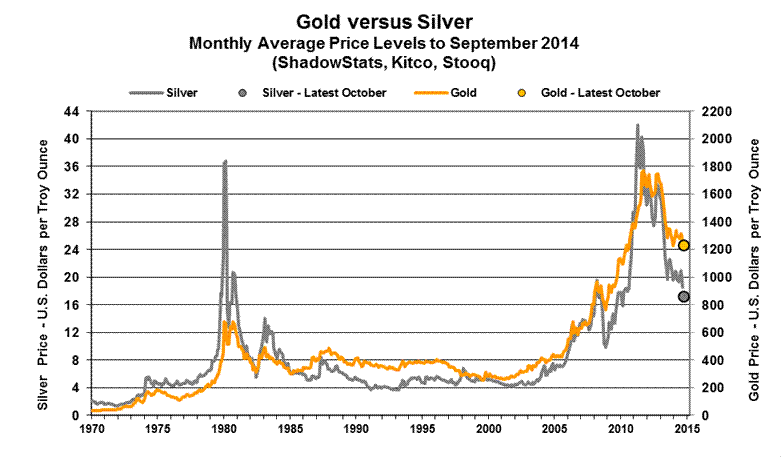 In like manner, the all-time high nominal price for silver in January 1980 of $49.45 per troy ounce (London afternoon fix, per silverinstitute.org), although approached in 2011, still has not been hit since 1980, including in terms of inflation-adjusted dollars. Based on September 2014 CPI-U inflation, the 1980 silver-price peak would be $151 per troy ounce and would be $659 per troy ounce in terms of September 2014 ShadowStats-Alternate-CPI (1980-Base) adjusted dollars (again, all series not seasonally adjusted).