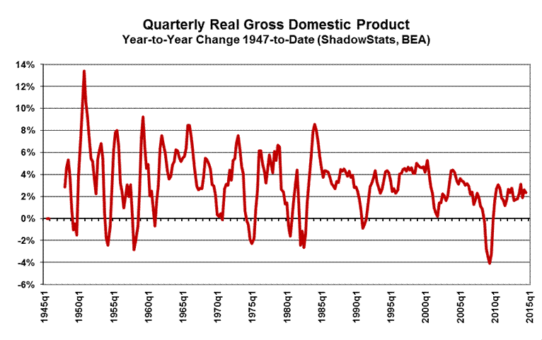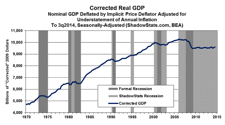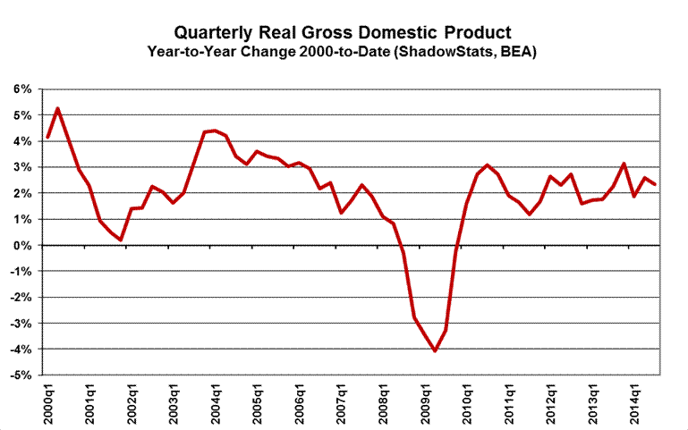 ShadowStats-Alternate GDP. The ShadowStats-Alternate GDP estimate for third-quarter 2014 GDP is a 1.7% year-to-year contraction (-1.7%) versus the headline GDP gain of 2.3%. Those third-quarter estimates were against a similar ShadowStats estimated 1.7% (-1.7%) year-to-year contraction but a headline year-to-year gain of 2.6% in second-quarter GDP (see the Alternate Data tab).