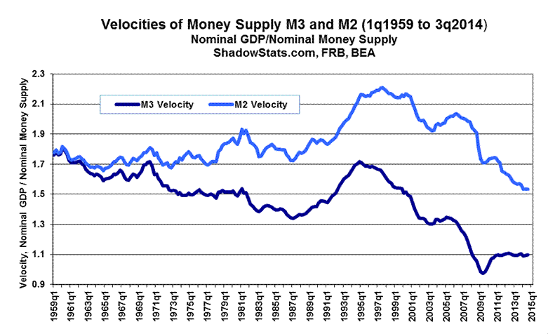 Money Supply Velocity. Incorporating the initial new nominal data on third-quarter 2014 GDP, as well as recent Federal Reserve benchmark revisions to money supply-related data, graphed below are updated estimates for the velocity of money, money supply M1, M2 and M3.
