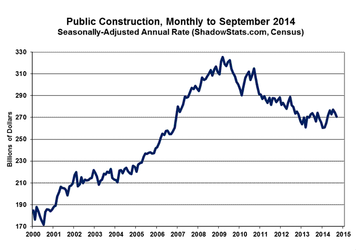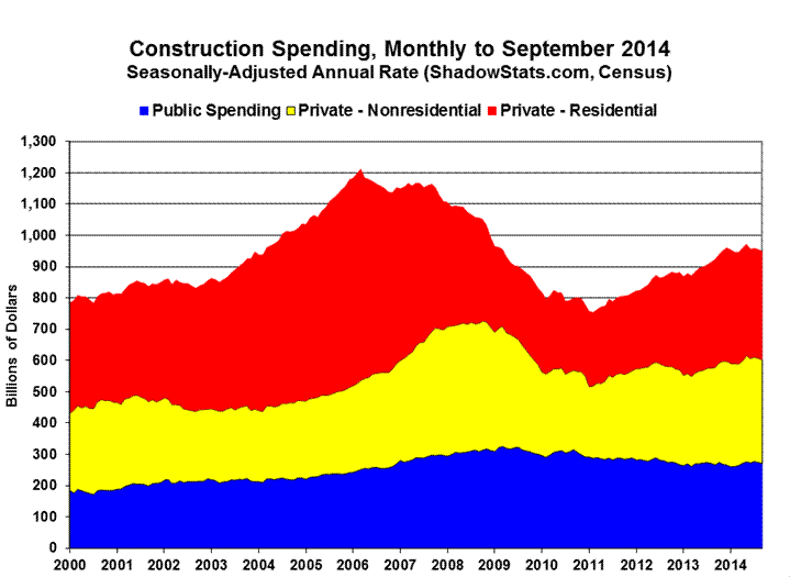 The statistically-insignificant 0.4% (-0.4%) monthly decline in September 2014 construction spending, versus the 0.5% (-0.5%) decline in August, included a 1.3% (-1.3%) drop in September public spending, versus a 1.0% (-1.0%) decline in August. September private construction fell by 0.1% (-0.1%) for the month, versus a 0.3% (-0.3%) decline in August.