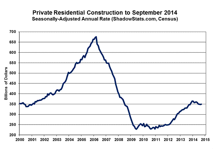 Third-quarter 2014 real (inflation-adjusted using the PPI New Construction Index) growth suggested an imputed annualized 0.27% quarterly gain, as of the August reporting, following an annualized second-quarter gain then of 2.18%. As of headline September reporting and revisions, however, the annualized quarterly real rate of change was a contraction of 2.55% (-2.55%) for the third-quarter, following revised annualized 1.99% gain in second-quarter 2014, along with the implications for a downside revision to GDP growth.