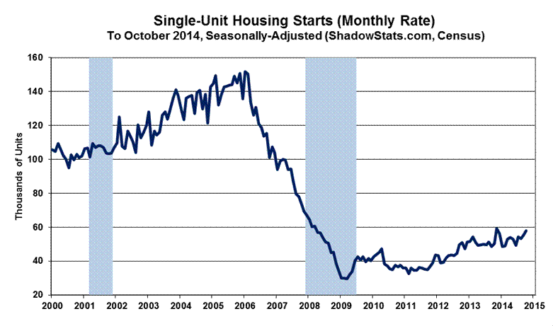 Housing starts for single-unit structures in October rose month-to-month by a statistically-insignificant gain of 4.2% +/- 10.3%, following a similar revised gain of 4.2% (previously up by 1.1%) in September, and versus a revised decline of 1.7% (-1.7%) [previously down by 2.0% (-2.0%), initially down by 2.4% (-2.4%)] in August. A statistically-significant October 2014 year-to-year gain of 15.4% +/- 11.8%, followed a revised September year-to-year gain of 14.8% [previously up by 11.9%], and a revised annual gain of 3.9% [previously up by 3.6%, initially up by 4.2%] in August.