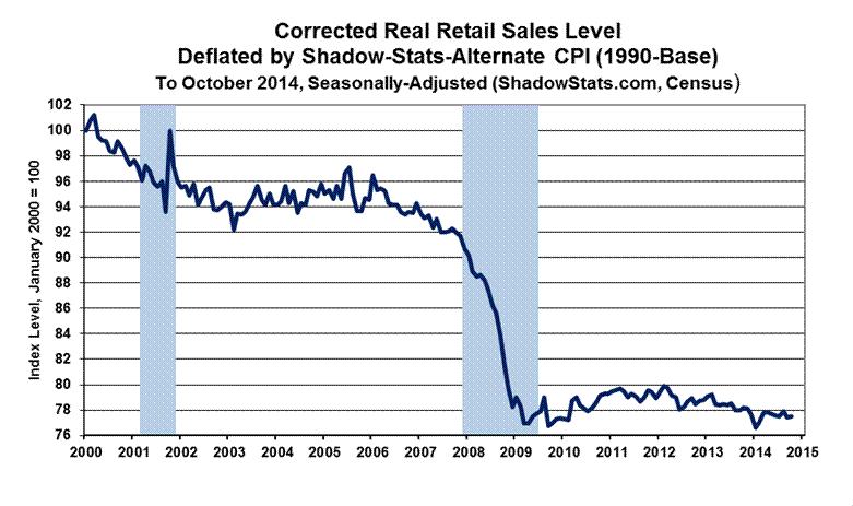 Corrected Real Retail Sales. The apparent “recovery” in the headline real retail sales series continues, due to the understatement of the rate of inflation used in deflating the retail sales series. Even as distorted though, the headline series appears to be stalling. As discussed more fully in Chapter 9 of 2014 Hyperinflation Report—Great Economic Tumble – Second Installment, deflation by too-low an inflation number (such as the CPI-U) results in the deflated series overstating inflation-adjusted economic growth.