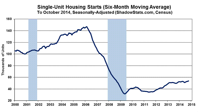 Longer-Range Reporting Trends. While gradual process of downside shifting in economic-growth expectations has been sporadic, underlying fundamental activity has remained extraordinarily negative. Other than for nonsense-growth in the headline second-quarter GDP (see Commentary No. 662), and the overstated initial third-quarter GDP growth estimate, renewed weakness has been, and increasingly will be seen in the post-election headline reporting of other major economic series (see 2014 Hyperinflation Report—Great Economic Tumble – Second Installment). Indeed, weaker-than-consensus economic reporting should become the general trend until the unfolding "new" recession receives broad recognition, which minimally would follow the next reporting of a headline contraction in real GDP growth (very possibly a culmination of pending downside revisions to the headline third-quarter 2014 GDP estimate).