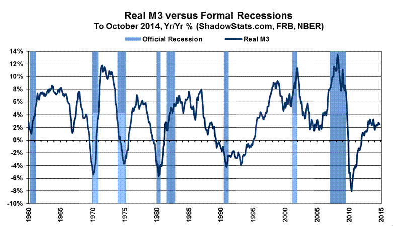 Real (Inflation-Adjusted) Money Supply M3—October 2014. The signal for a double-dip or ongoing recession, based on annual contraction in the real (inflation-adjusted) broad money supply (M3), remains in place and continues, despite real annual M3 growth holding in positive territory. As shown in the accompanying graph—based on October 2014 CPI-U reporting and the latest ShadowStats-Ongoing M3 Estimate—annual inflation-adjusted growth in M3 for October 2014 held at 2.6% for a second month. The unchanged growth rate reflected the pace of annual headline M3 growth holding at 4.2% in October, as well as the annual change in unadjusted CPI-U holding at 1.6% in October.