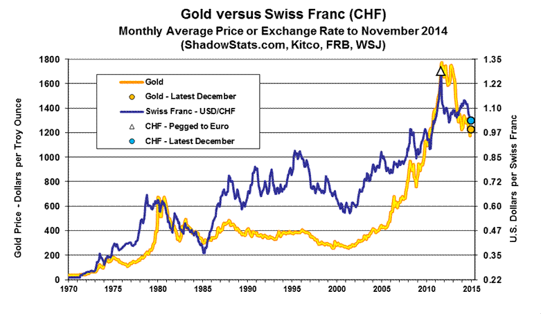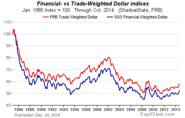 The first graph following plots the average monthly level of the Fed’s Major Currency Trade-Weighted U.S. Dollar and the ShadowStats Financial-Weighted U.S. Dollar through November 2014 (see the Alternate Data tab at www.ShadowStats.com), showing the recent uptrend in the dollar in the context of movement that still is well within the trading bounds of the post-panic period.