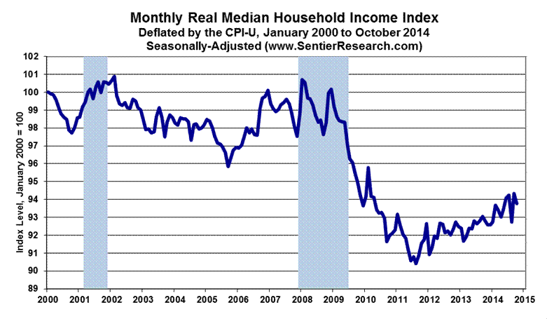 Intractable Consumer-Liquidity Issues Still Severely Constrain Retail Sales Activity. Updating the real median household income discussion of Commentary No. 679, and the last regular discussion of structural consumer liquidity problems in Commentary No. 678, the following graphs reflect the latest information available, including the October 2014 consumer credit numbers released recently by the Federal Reserve.
