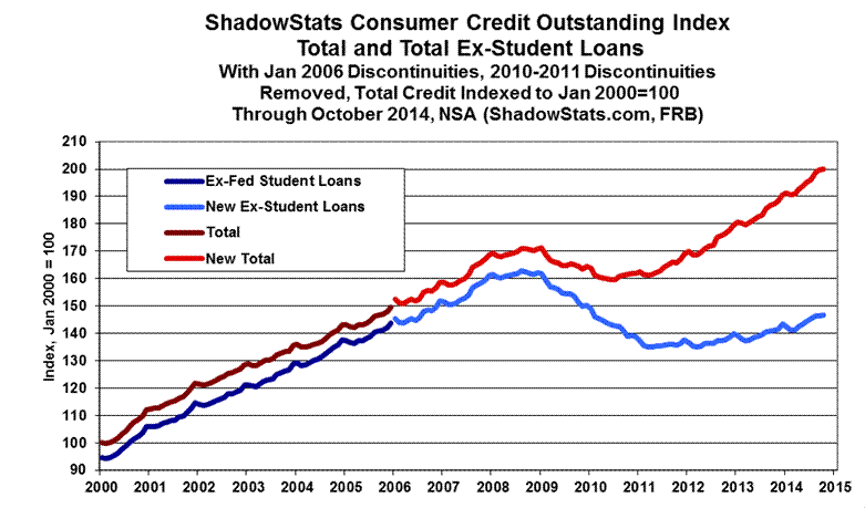 Growth in consumer credit, post-2008 Panic, has continued to be dominated by growth in federally-held student loans, not in bank loans to consumers that otherwise would fuel broad consumption growth. The upside notch in September 2014 student-loan activity reflected the regular seasonal jump at the beginning of the school year, while the subsequent October activity flattened out. These disaggregated data are available and plotted only on a not-seasonally-adjusted basis.