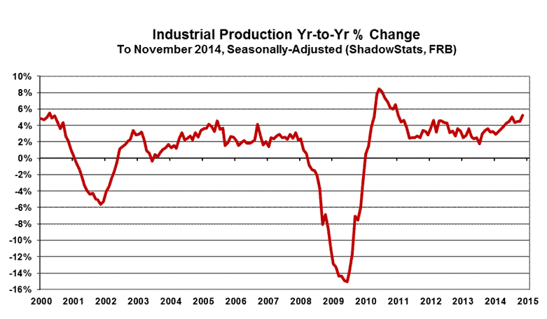 Index of Industrial Production—November 2014—Pending, Massive Downside Benchmark Revisions. The Federal Reserve publishes an annual benchmark revision to the industrial production series, each year, correcting historical detail for more complete information as it becomes available. The March 2014 benchmark revision, however, largely was incomplete, lacking detail from the regular Census of Manufactures (2012), which apparently had been delayed in its release by the government shutdown of October 2013. As a result, what should have been massive downside revisions to 2012 and 2013 industrial production activity (and broader GDP activity) never took place (see Commentary No. 613).
