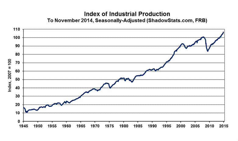 Production Graphs. The following two sets of graphs reflect headline industrial production activity to date. The first graph in the first set shows the monthly level of the production index, with November 2014 setting an historic high level for the series. The second graph shows the year-to-year percentage change in the same series for recent historical detail, beginning January 2000, with the current level at its highest since January 2011. The second set of graphs shows the same data in historical context since World War II.
