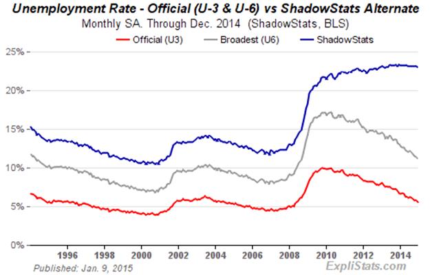 When the headline unemployed become "discouraged," they are rolled over from U.3 to U.6. As the headline, short-term discouraged workers roll over into long-term discouraged status, they move into the ShadowStats measure, where they remain. Aside from attrition, they are not defined out of existence for political convenience, hence the longer-term divergence between the various unemployment rates. Further detail is discussed in the Reporting Detail section. The resulting difference here is between a headline December 2014 unemployment rates of 5.6% (U.3) and 23.0% (ShadowStats).